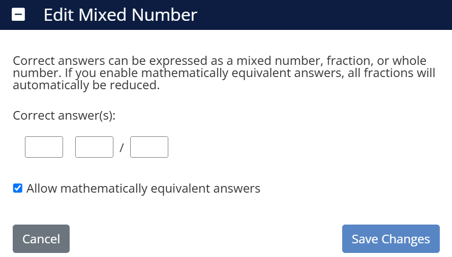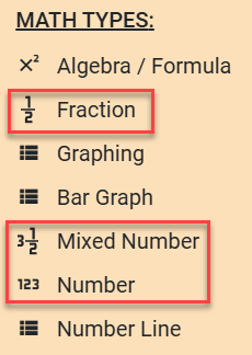 The Number, Fraction, and Mixed Number question types all behave similarly once you know where to find them. Try each one to see which works best for your Activity and your students’ needs.