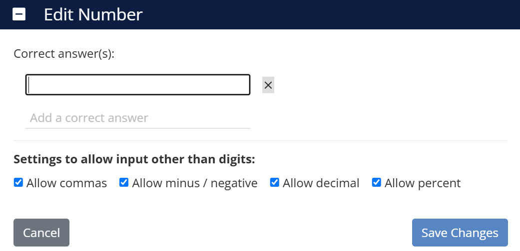 Correct answer(s): Enter the number you want marked as correct. You can add up to 10 correct answers by clicking Add a correct answer and typing additional values.