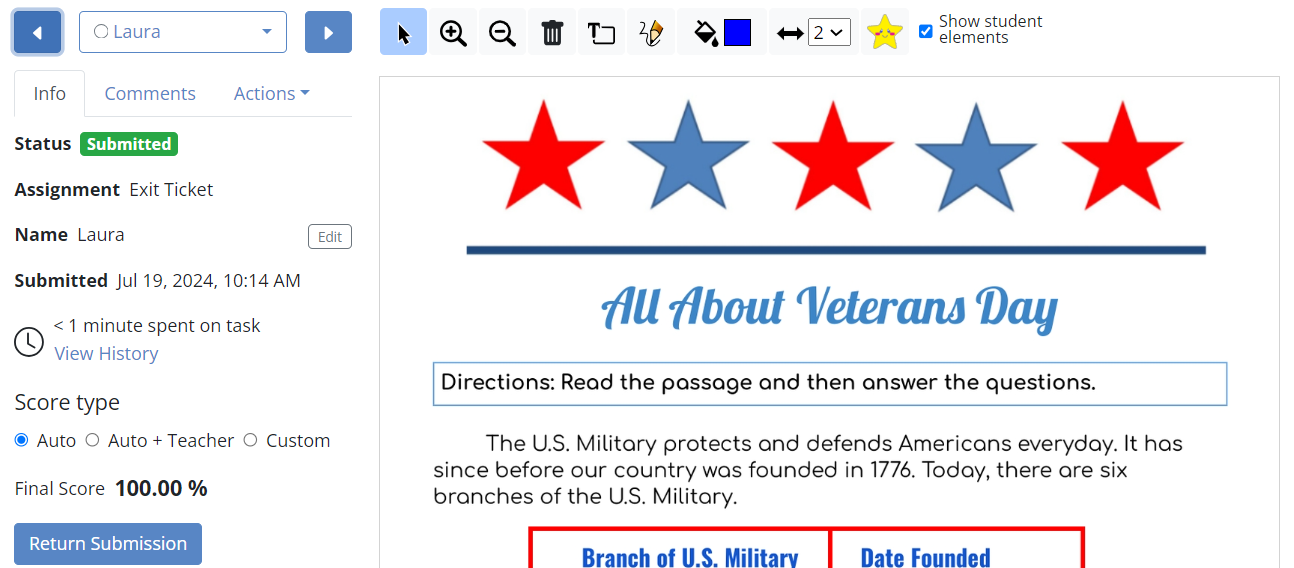 This area to the left of your student’s work shows the details of the Assignment (status, time submitted, time on task, history). This is also where you are able to quickly scroll through student's Assignments, score your students' work, leave a comment, return work to a student, and print a copy!