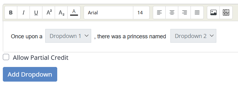 Start by typing, “Once upon a” into the box that says, Write Text here and then choose, Add Dropdown. The Add Dropdown button will create a new drop-down wherever the typing cursor happens to be.