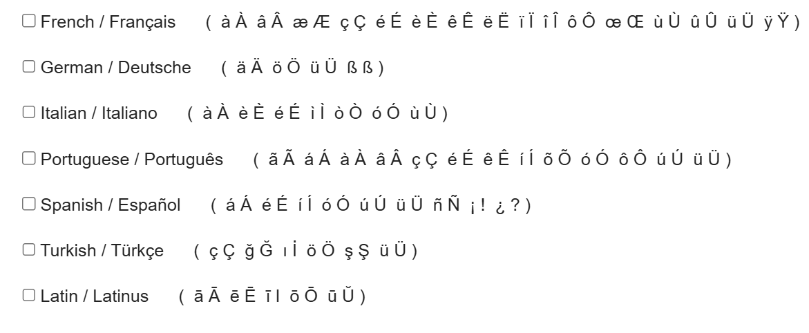 That will bring up a list of the special character sets that Classwork.com supports. You can check off as many as you'd like. Then click Save.
