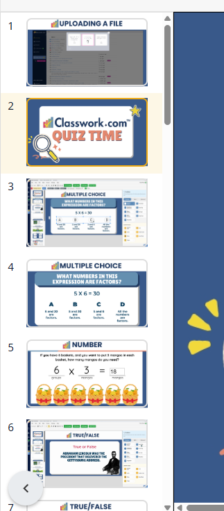 The Slides display type gives you the structure of a slide deck with the power of interactive, auto-scored Classwork Activities.